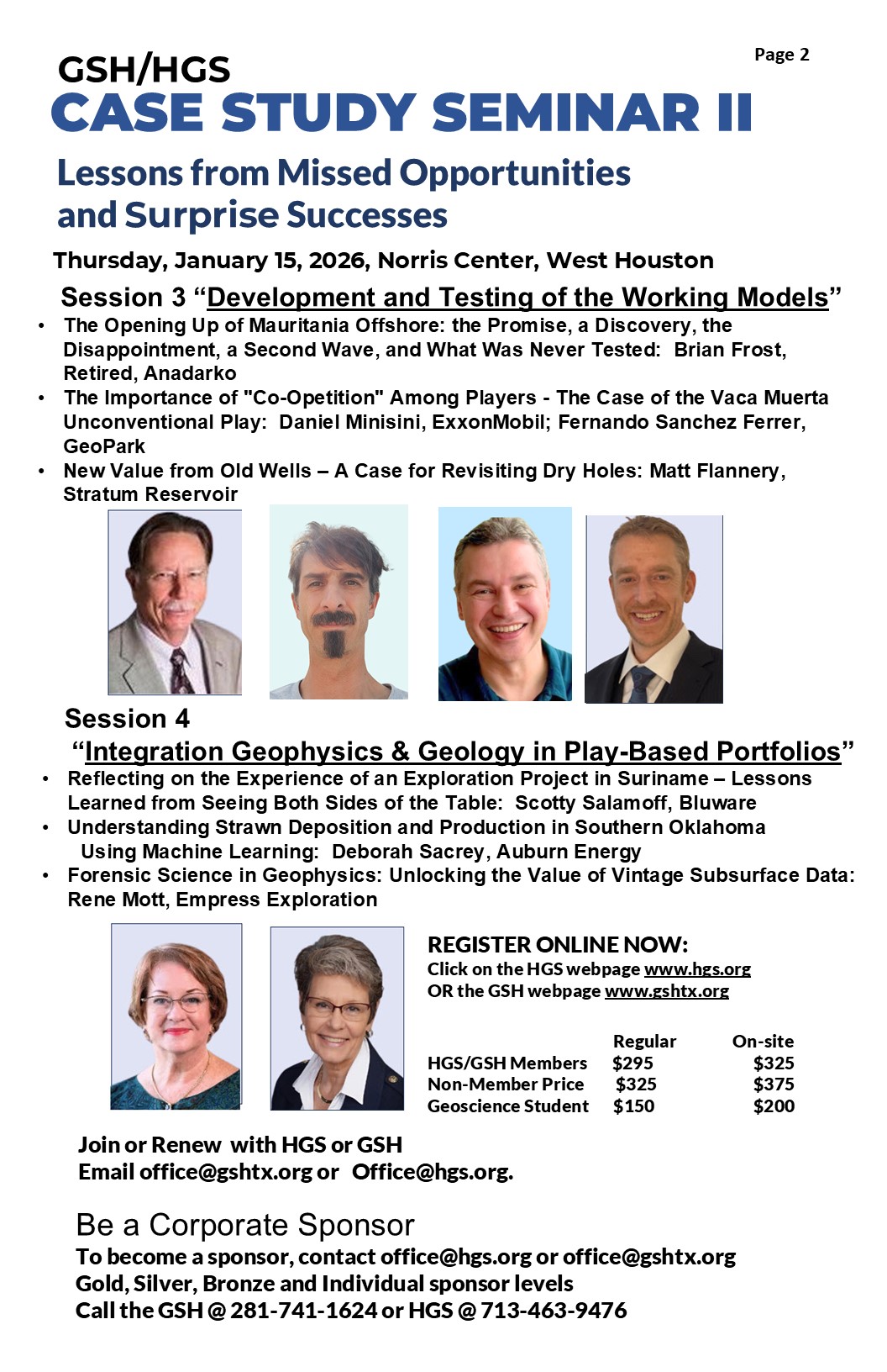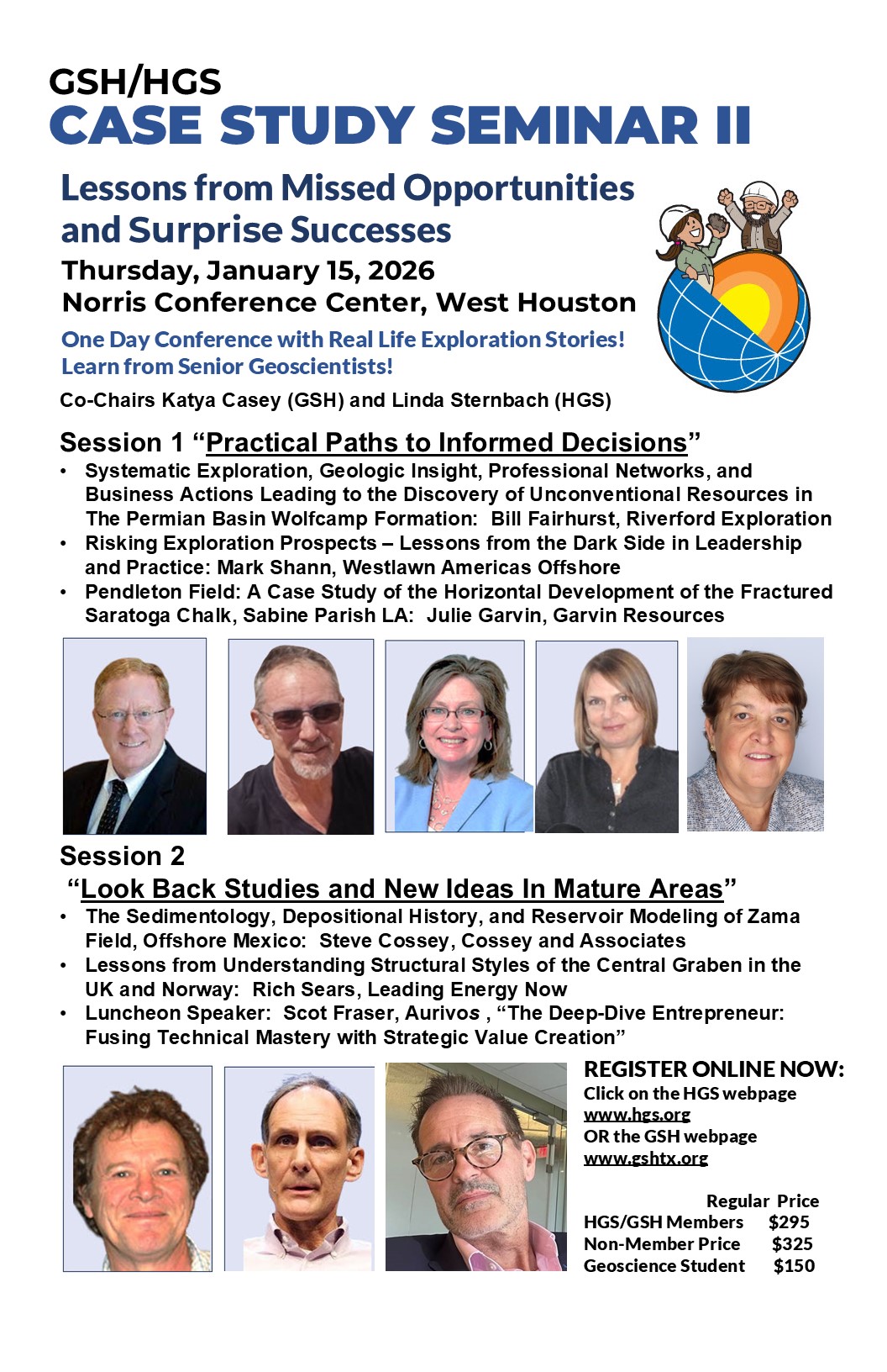 Join the Case Study Seminar co-chairs, Katya Casey (GSH) and Linda Sternbach (HGS), and absorb insights from Society leaders Rene Mott (GSH President), Patty Walker (HGS President), AAPG Past President Deborah Sacrey, AAPG President Elect, John Casiano; HGS Past President Jeff Lund; SEG President Joe Reilly; and SEG and AAPG Legend Mike Forrest. We recommend staying late for the included “Networking Happy Hour,” starting at 5:30 PM at the Norris Center, where all attendees and speakers can network in person.